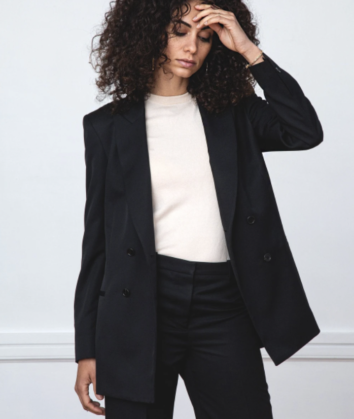 • veste de tailleur c/o Patte Blanche Atelier (100% polyester recyclé et doublure cupro – Je porte le tailleur dans son ensemble ici)
